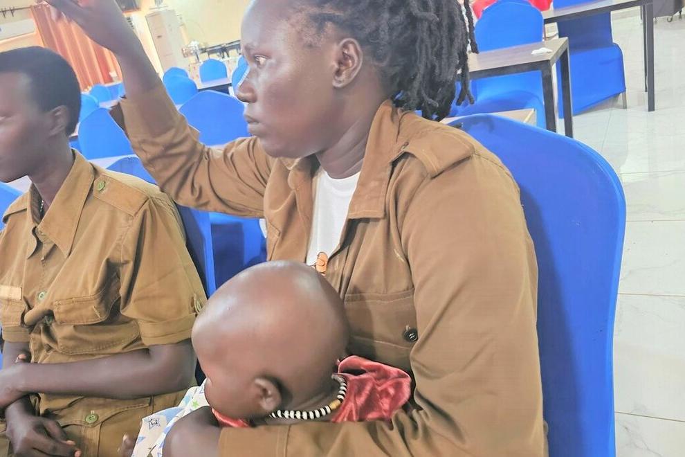 Ajok is a maternity nurse at Bor Central Prison. A master in balancing family with work, she participated in UNMISS gender-responsiveness training for prison officers while breastfeeding her own child, proving that motherhood is no barrier to career development.