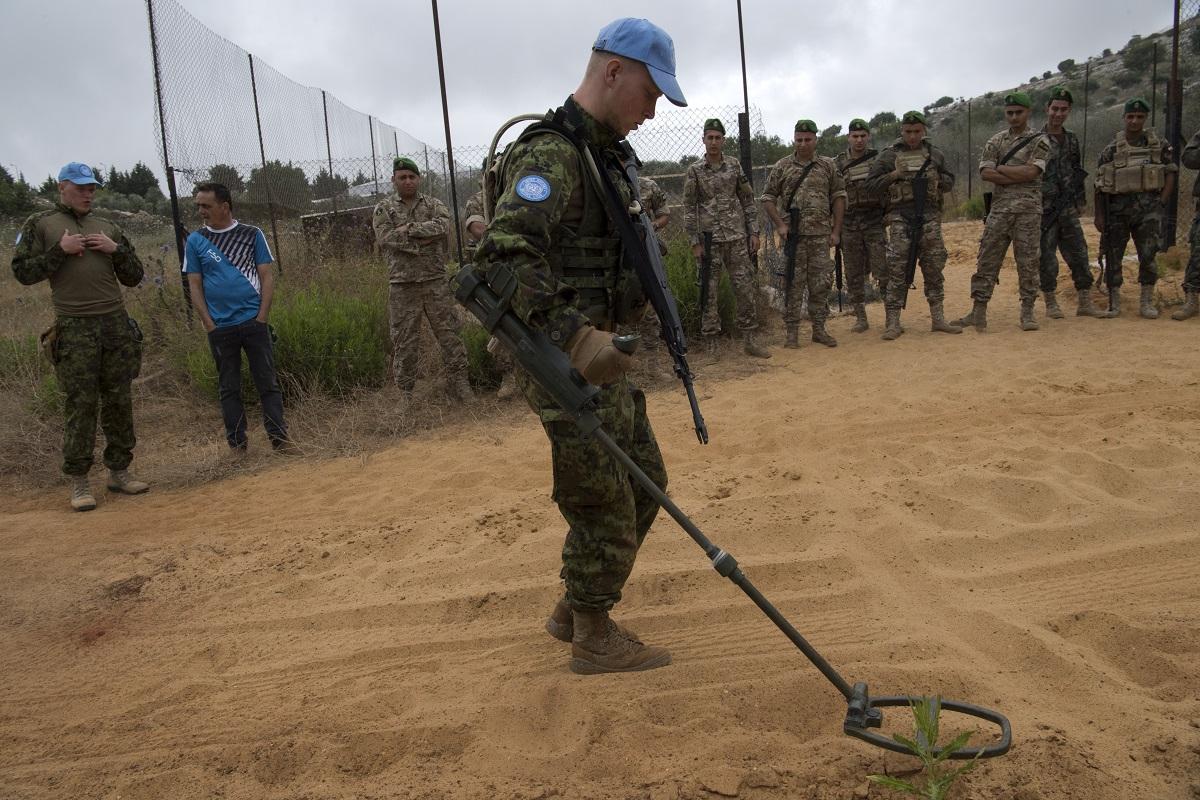 The soldiers from the Lebanese Armed Forces (LAF) watch intently as a small unit of UNIFIL Estonian peacekeepers demonstrates the systematic technique to scan for improvised explosive devices (IEDs) while on patrol. The…