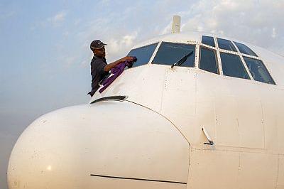 UNMISS staff cleaning mission’s aircraft during service ahead of another trip. Photo: UNMISS/ JC McIlwaine