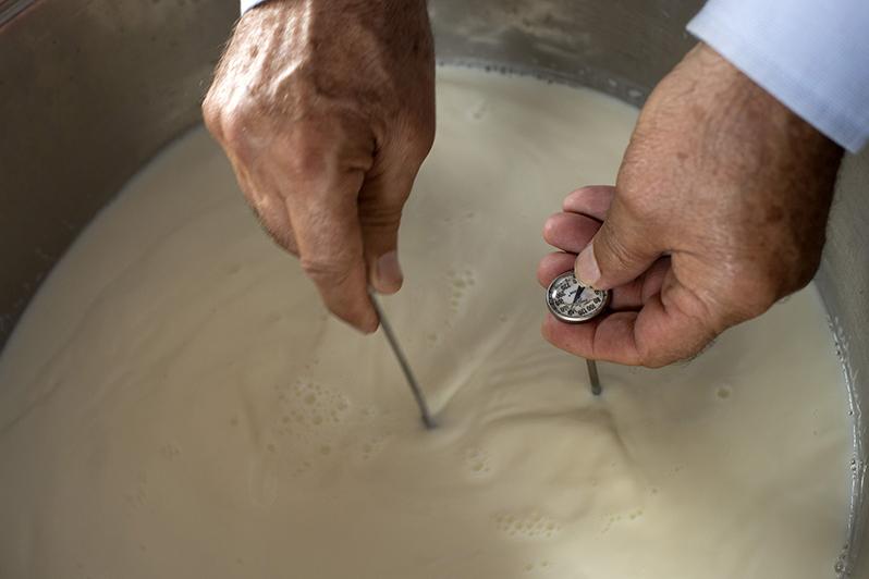 The instructor checking the milk temperature while heating.