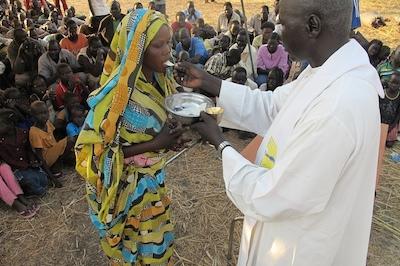Young girl receiving Communion during mass at displaced persons camp on UNMISS base in conflict-torn Bentiu, Unity State. Photo: UNMISS/Anna Adhikari