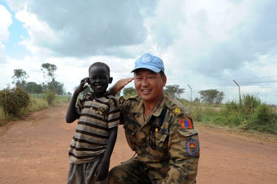 Local boy and member of Mongolian contingent deployed in Bentiu, Unity State. As of 19 February 2013, UNMISS military personnel consists of 6,478 troops and 142 Military Liaison Officers from 50 contributing countries. Photo…