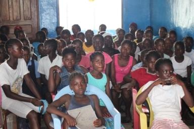 Julie Ballah, 13, held out a portrait of a girl studying under candle light. The portrait was her own handiwork, resulting from a training programme for adolescent girls. “Due to the Joint Programme on Adolescent Girls…