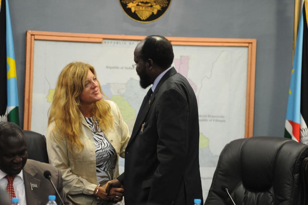 SRSG Hilde F. Johnson greeting President Salva Kiir Mayardit at her briefing of Council of Ministers on mission's achievements and renewed mandate in Juba on 17 August 2012. Photo: UNMISS/Isaac Billy.