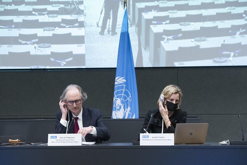 Geir O. Pedersen, United Nations Special Envoy for Syria, briefs the before the opening of the Syrian Constitutional Committee. UN Photo by Violaine Martin
