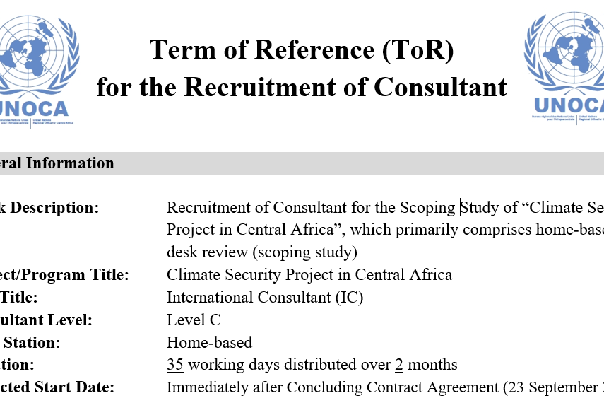 Call for applications for the recruitment of an international Consultant for the scoping study of “Climate Security Project in Central Africa”. Application should be sent by Email to Ms Megumi Yoshii ( yoshii@un.org ) copying…